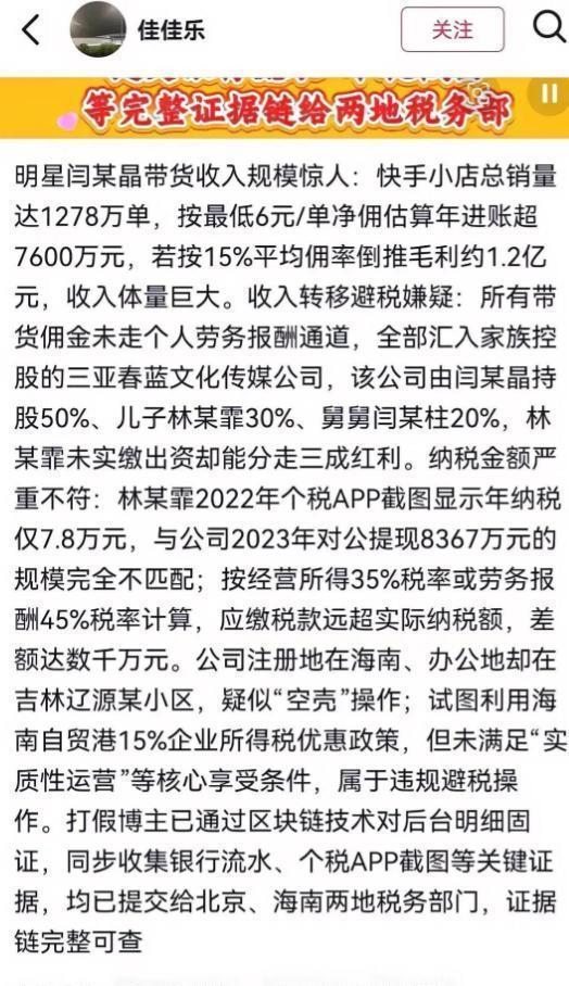 与普通举报不同,此次举报的证据链极为完备,不仅包含直播平台后台完整交易记录、公司对公账户流水、税务申报截图,还通过区块链技术进行了固定,确保证据无法篡改,从根本上杜绝了销毁、篡改证据的可能。举报的核心直指闫学晶涉嫌违规避税:她将巨额直播带货收入转入自家公司,借助海南的税收优惠政策规避足额纳税,导致实际收入与纳税额严重不符。